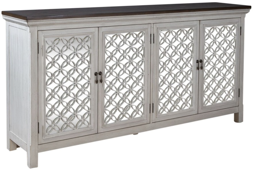 Transform your home with the Westridge 72" accent cabinet. Crafted of eucalyptus solids and ash veneers in an antique white finish. Features four mirrored doors with decorative floral pattern overlays, block feet and one concealed fixed shelf behind doors. A unique piece that will work with any décor from traditional to contemporary.Read More