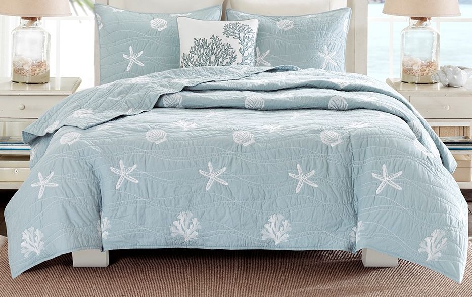 Harbor House Seaside creates a calm coastal look in your bedroom. The embroidered starfish and seashell motifs on a cool dusty blue background enhance the coastal look for a casual update. The square decorative pillow features embroidered coral. The bedding set includes 1 quilt, 2 shams, and 1 decorative pillow.