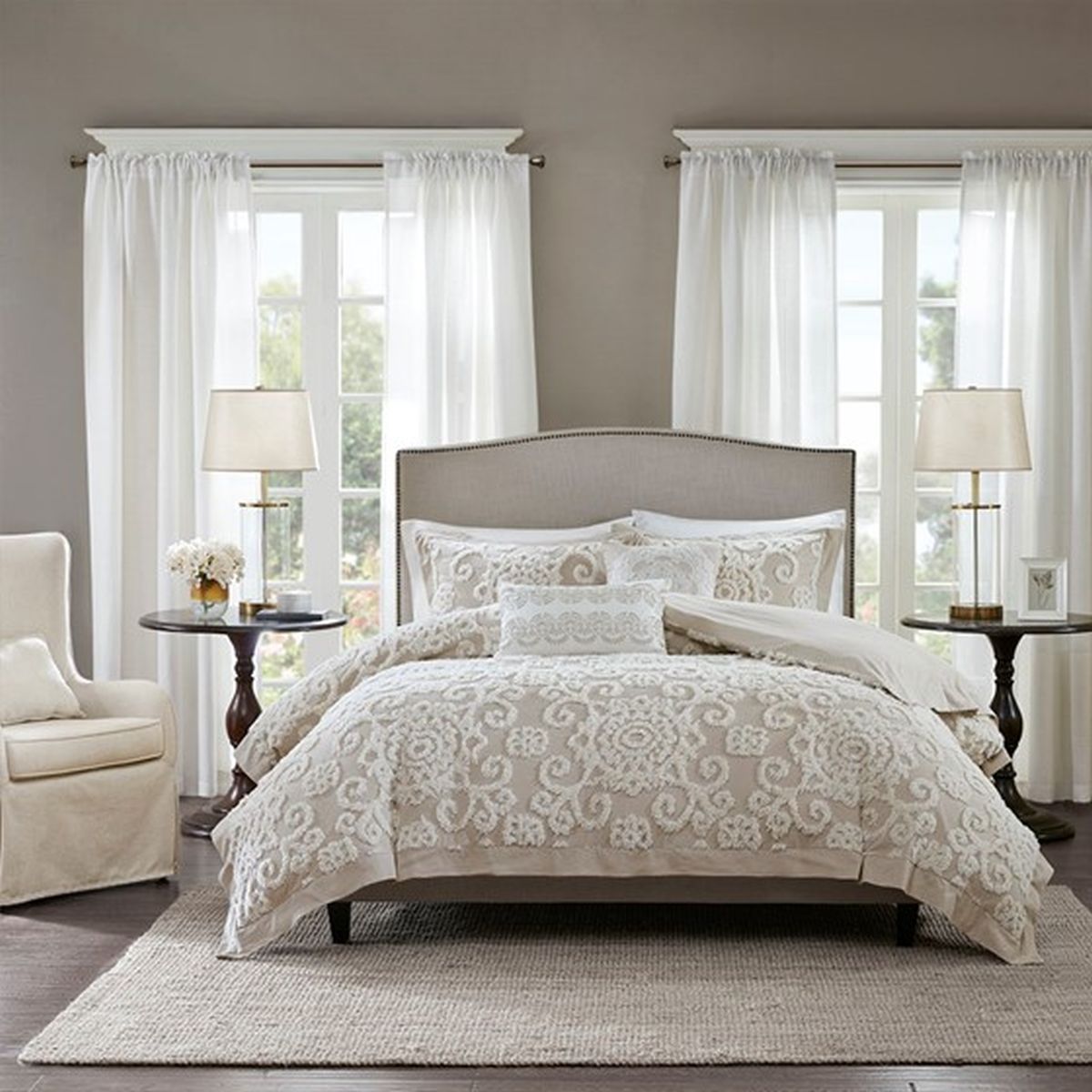 The Harbor House Suzanna Comforter Mini Set is the perfect addition to make your bedroom classically comfortable. Delicately tufted medallions are beautifully showcased throughout this comforter in a gorgeous taupe hue, giving your bedroom a soft homey feel. Matching sham(s) showcase the same beautiful technique to provide a coordinated and charming finish. Made from 100% cotton, this oversized and overfilled comforter will provide you with the utmost comfort and give you bedroom an elegant update.