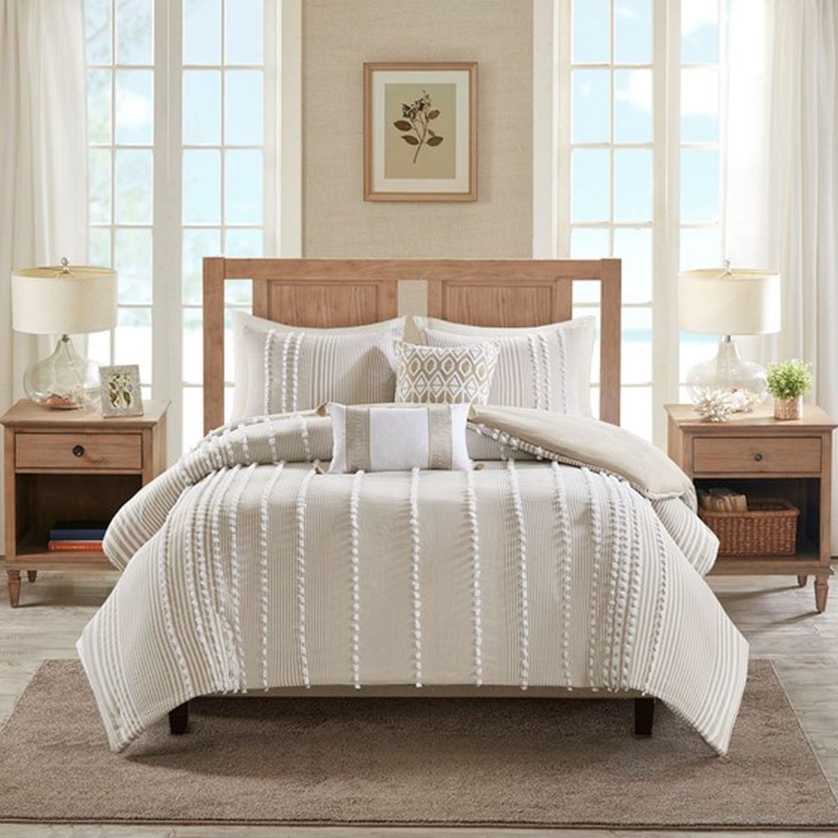 Update your bedroom with the casual beauty of the Harbor House Anslee Cotton Yarn Dyed 3 Piece Comforter Set. Oversized and overfilled, this cotton yarn dyed comforter showcases stripes of various widths in soft taupe and white hues. Tufted chenille details add alluring texture and dimension and flaunt a chic, farmhouse appeal. A solid taupe reverse complements the top of the bed, while two cotton shams reiterate the design of the comforter for a coordinated look. Made from 100% cotton, this comforter will provide you with the utmost comfort and give you bedroom a refreshing update.