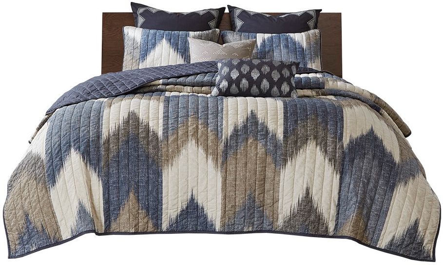 Spice up your bedroom with the INK+IVY Alpine coverlet. Rich shades of navy and taupe play up this broken chevron motif for a casual update to your home. The solid navy reverse creates a perfect overall balance. The all-over channel-quilted coverlet comes with 2 shams to complete the set.