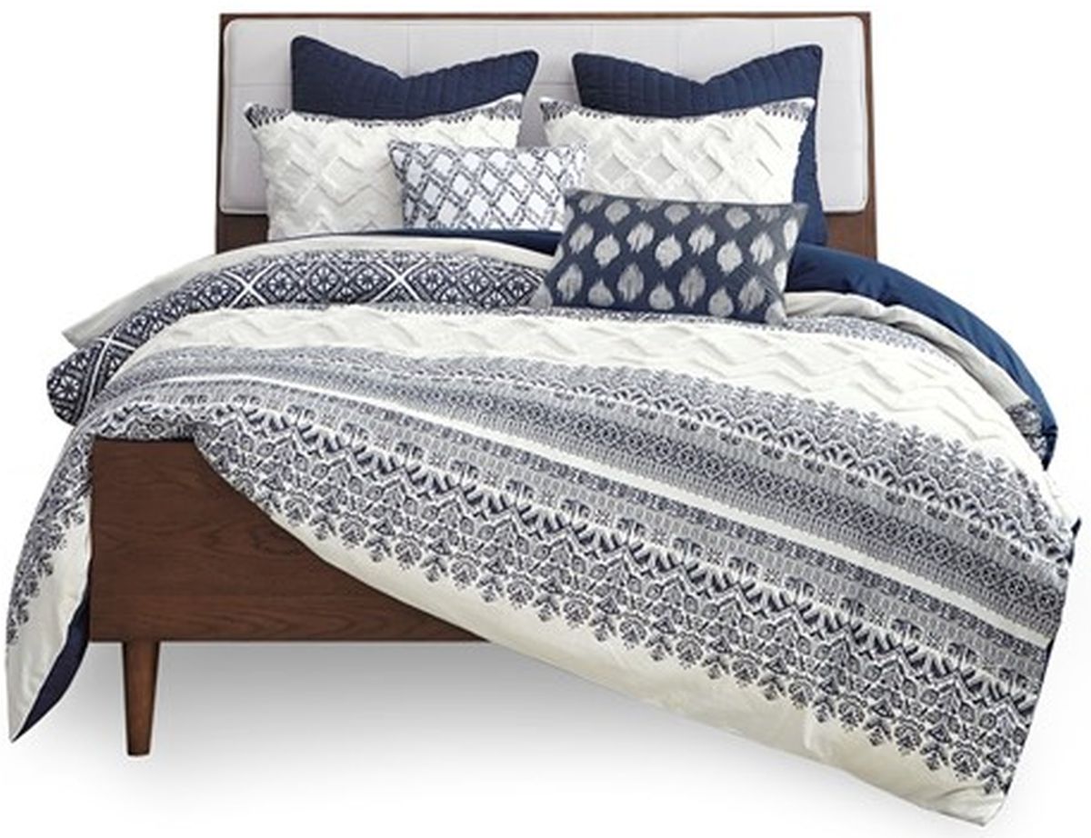 Transform you bedroom with the charming shabby chic allure of the INK+IVY Mila Cotton Printed Duvet Cover Set with Tufted Chenille. The cotton duvet cover flaunts an updated navy botanic print, on a natural white ground, with tufted white chenille, in a chevron design, to create a charming farmhouse look.Read More