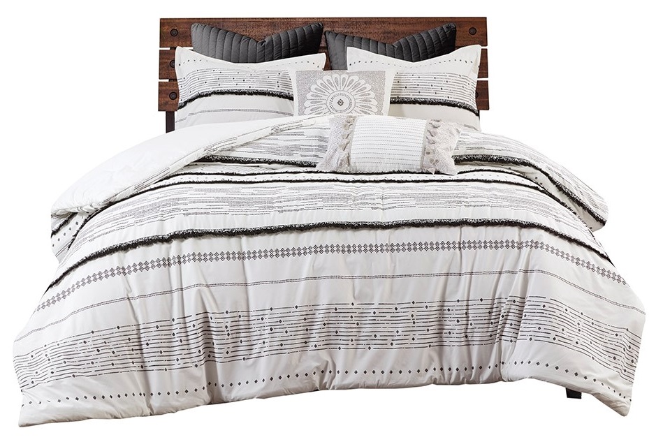 Give your bedroom a shabby chic update with the INK+IVY Cotton Printed Comforter Set with Trims. The 100% cotton comforter features a black stripe print with 6 rows of cotton tufted trims that add dimension to the charming boho look.Read More