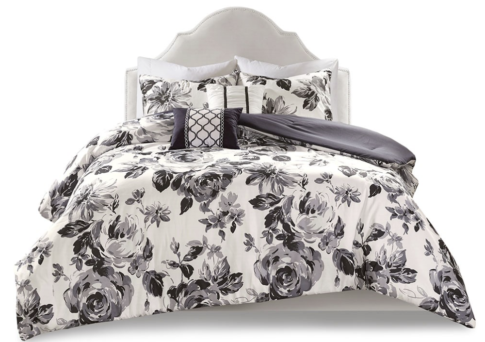 Olliix by Intelligent Design Black and White Full/Queen Dorsey Floral Print Comforter Set
