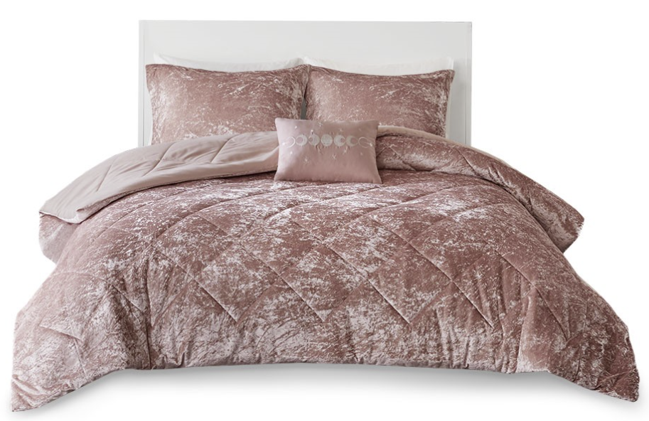 Matching crushed velvet sham(s) and an oblong decorative pillow complements the comforter to complete the modern style bedding set. Machine washable for easy care, this velvet comforter set uses hypoallergenic filling in the comforter and a decorative pillow for extra softness and comfort. Feel the warmth and lustrous beauty of this velvet comforter set when you incorporate it into your bedroom decor.