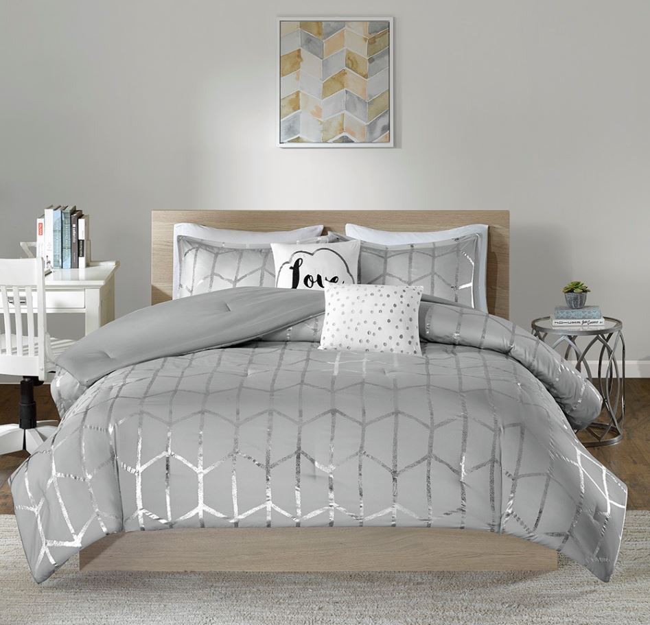 Silver metallic geometric print on grey comforter set.