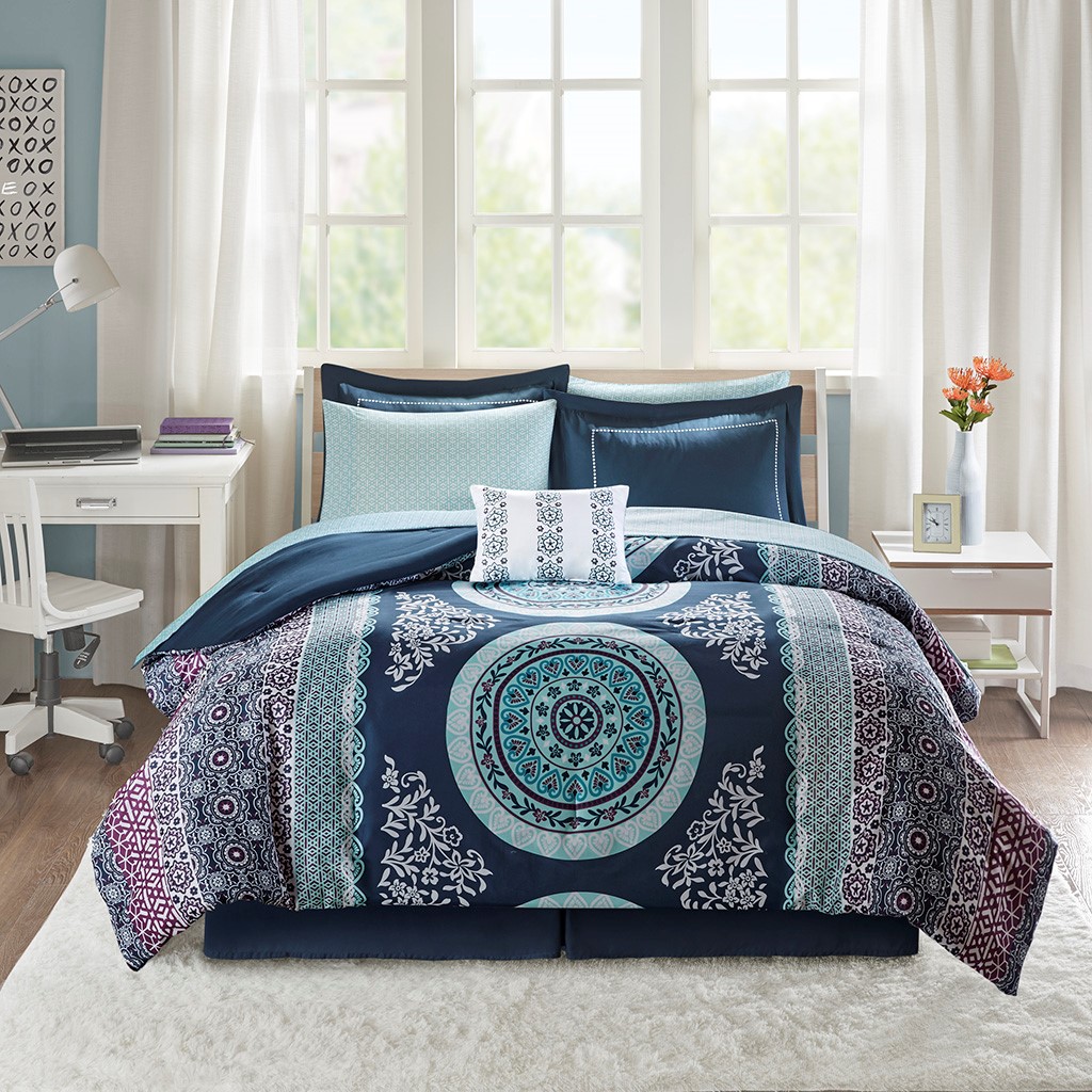 The Intelligent Design Loretta Complete Bed and Sheet Set brings a bright, casual update to your bedroom. A large medallion print, in coral and aqua, runs down the center of the comforter with subtle bohemian details highlighted in white.Read More