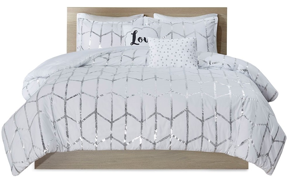 Freshen up your bedroom with the enchanting style of Intelligent Design’s Raina Metallic Printed Comforter Set. The stunning comforter flaunts a geometric, metallic silver print against a solid white ground for a fun and eye-catching look! Matching sham(s) echo the design seen on top of the bed to pull the entire ensemble together.Read More