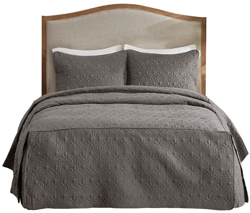 The Madison Park Quebec 3 Piece Fitted Bedspread Set offers a chic classic update to your bedroom décor. This classic split corner, dark grey bedspread features all-over quilted box sewing with a 24-inch drop on the sides.Read More