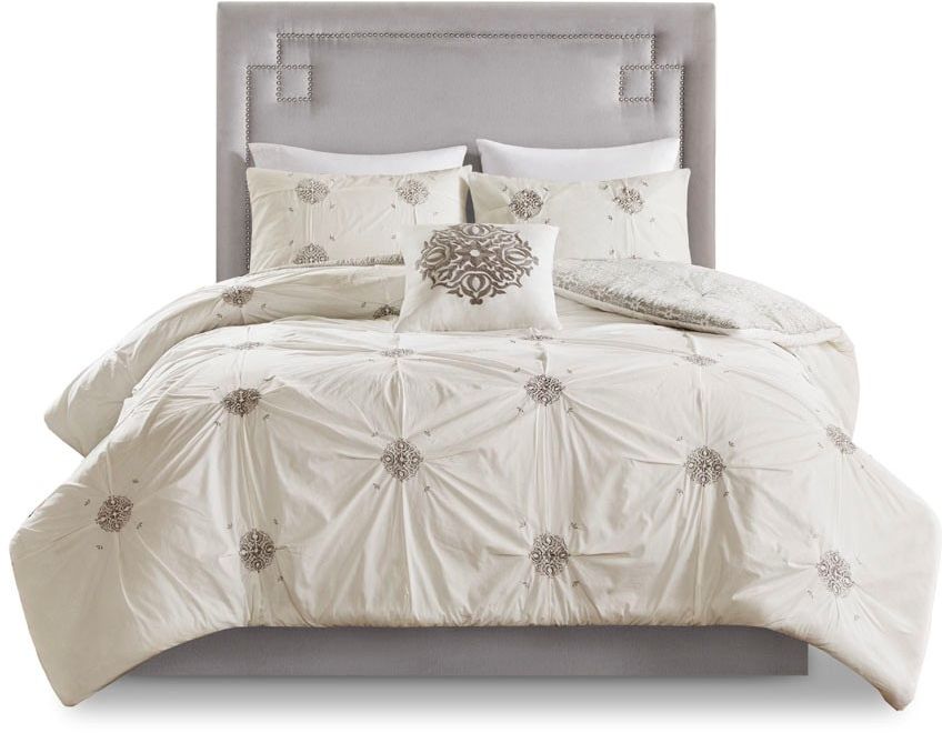 Style your bedroom with the shabby chic allure of the Madison Park Malia 4 Piece Embroidered Cotton Reversible Duvet Cover Set. The face of the reversible duvet cover features tufted grey embroidery on an ivory base, while the reverse showcases an all-over grey medallion print that complements the top of the bed.Read More