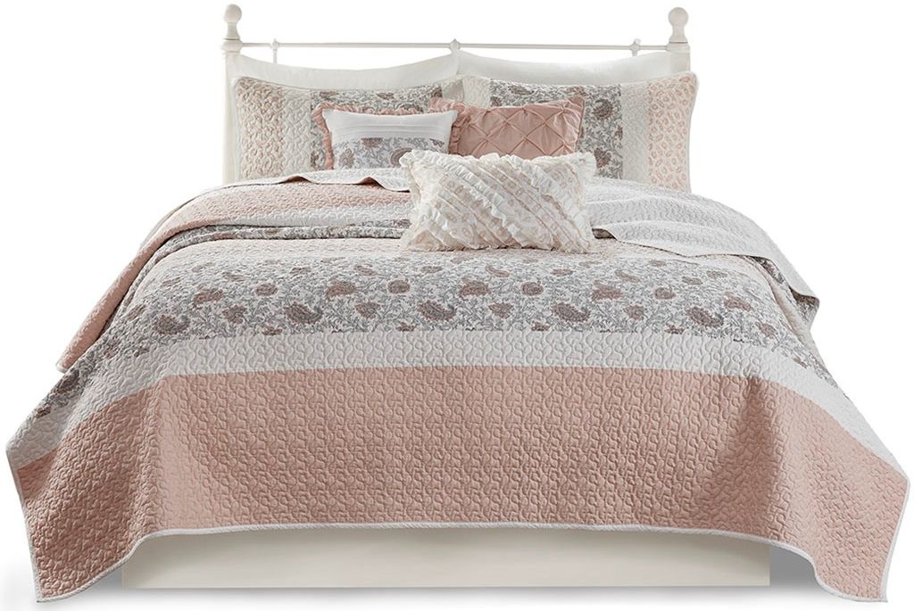 The Madison Park Dawn 6 Piece Cotton Percale Reversible Coverlet Set offers a shabby chic update to your bedroom decor. A paisley print is featured on the cotton coverlet with pin-tucked fabric separated by lace taping embellishments. Matching shams mirror the design of the coverlet, while three decorative pillows and a solid bed skirt complete this reversible farmhouse coverlet set. This bedding set is also OEKO-TEX certified, meaning it does not contain any harmful substances or chemicals to ensure quality comfort and wellness. A coordinating shower curtain is available and sold separately.
