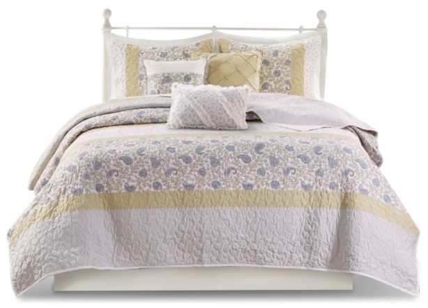The Madison Park Dawn 6 Piece Cotton Percale Reversible Coverlet Set offers a shabby chic update to your bedroom decor. A paisley print is featured on the cotton coverlet with pintucked fabric separated by lace taping embellishments.Read More