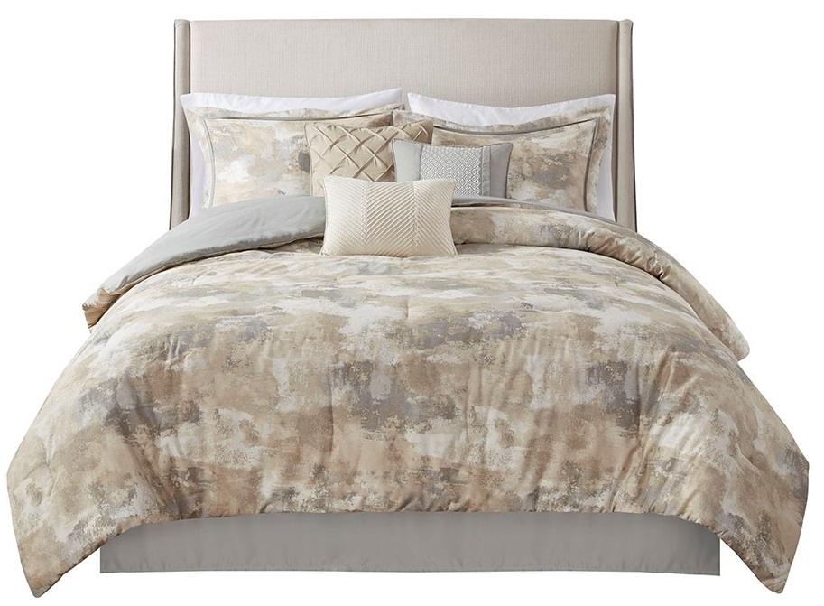 Modernize your bedroom decor with the chic styling of the Madison Park Beacon 7 Piece Comforter Set. This luxurious comforter features an abstract print in various gray, taupe and cream color on the cotton-rich ottoman face with a solid grey reverse to create a glamorous look.Read More