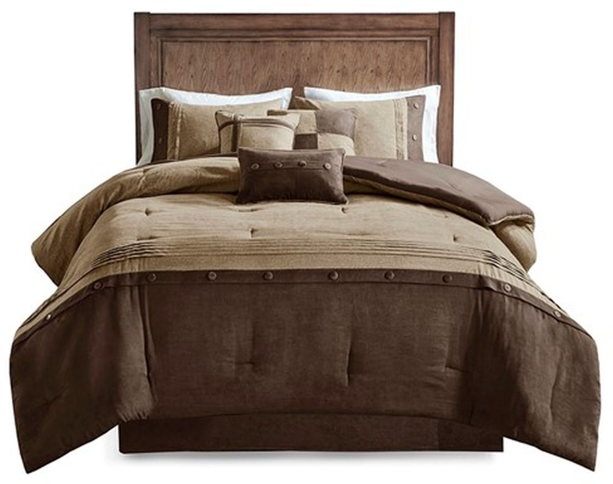 For a warm, lodge look in your space, the Madison Park Boone Collection is perfect for you. The unique fabric used in this set has a textured earthy print pieced with polyester microsuede at the bottom and buttons for a personal touch. Three decorative pillows using piecing and embroidery of both top of bed fabrics completing this cohesive look.