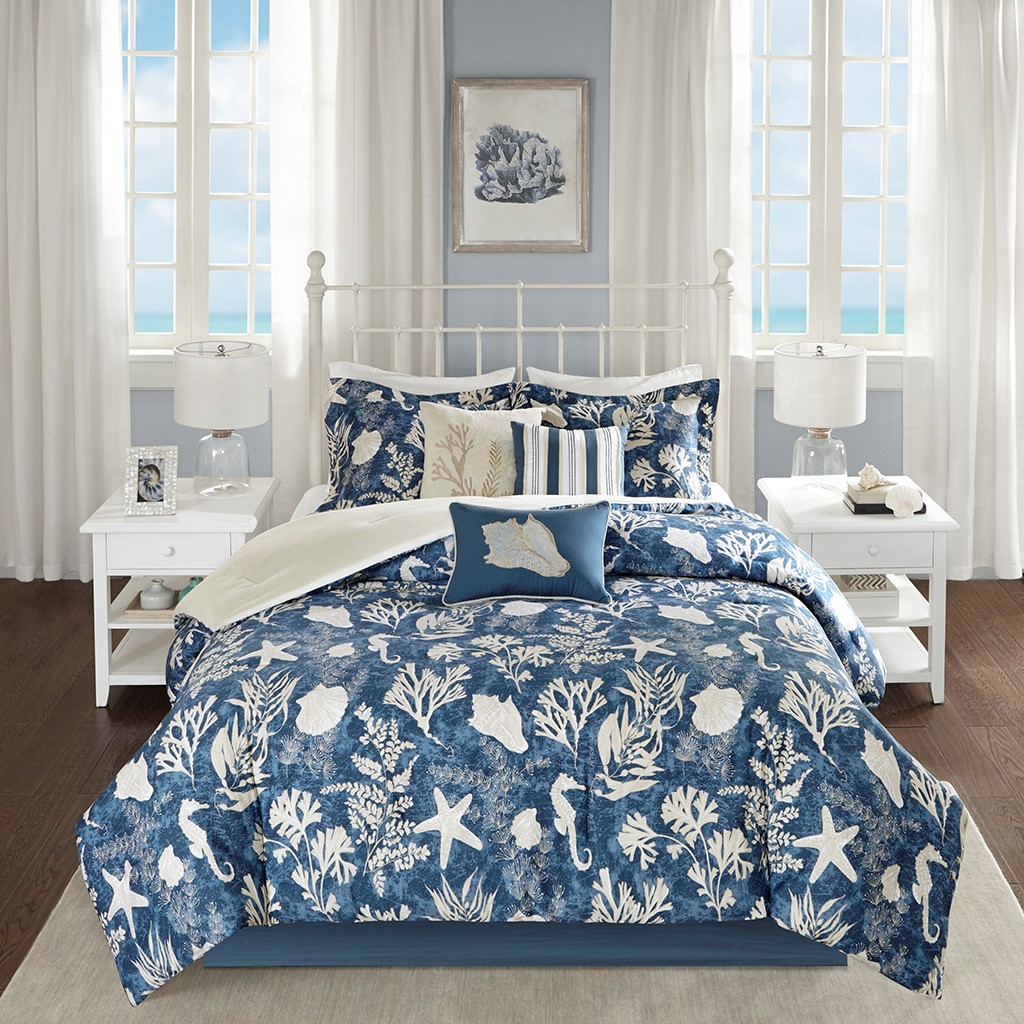 Refresh your bedroom with the coastal style of the Madison Park Cape Cod 7 Piece Cotton Sateen Comforter Set. A charming coastal motif and an elegant sheen adorn the blue comforter, while a solid taupe reverse adds a rich touch of color. The matching shams repeat the design of the comforter, for a coordinated look. Three embroidered decorative pillows harmonize with the top of the bed and the solid blue bed skirt provides a clean finish. Made from cotton sateen, this bedding set is OEKO-TEX certified, meaning it does not contain any harmful substances or chemicals to ensure quality comfort and wellness.