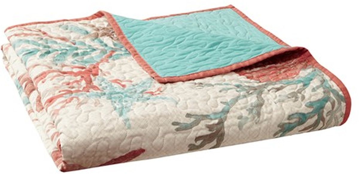 This Madison Park quilted throw creates a casual coastal look. The throw features starfish and coral motifs accentuated with coral and aqua colors and reverses to an aqua blue. It's oversized and overfilled for added comfort and style.