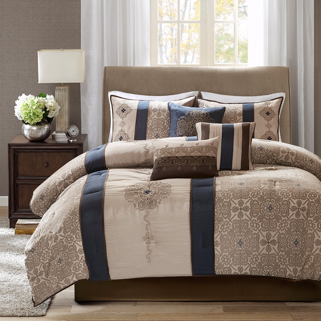Classically stylish, the Madison Park Donovan 7 Piece Comforter Set turns your bedroom into a luxurious getaway. The jacquard woven comforter showcases an elegant color palette in navy, taupe, ivory, and brown accented three embroidered medallions. Matching shams coordinate beautifully with the top of the comforter, while a brown bed skirt provides extra charm to the bedspread. A solid brown reverse adds a bold and neutral touch to the comforter set. Three decorative pillows feature fabric manipulation and embroidered details to complement the design, completing the ensemble.