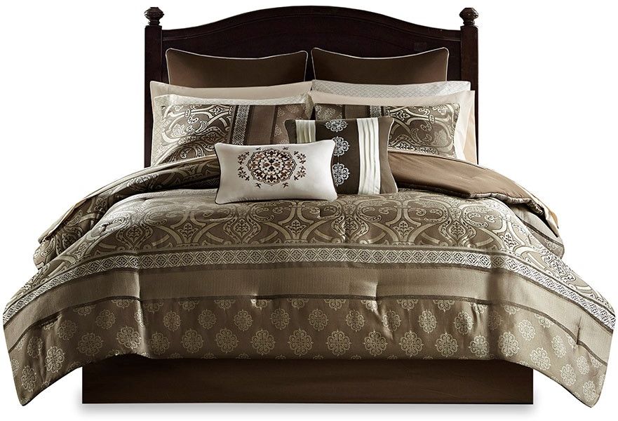 The Madison Park Essentials Zara 16 Piece Jacquard Complete Bedding Set with 2 Sheet Sets offers a luxurious traditional update for your bedroom. An elegant jacquard design, in shades of brown, adorns the face on the comforter and a solid dark brown reverse complements the top of the bed.Read More