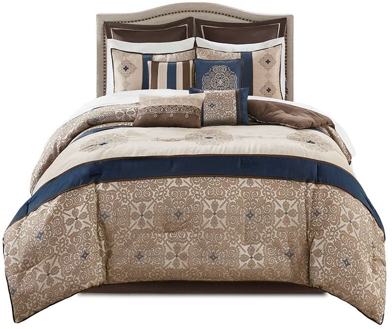 The Madison Park Essentials Delaney 24 Piece Room in a Bag offers a refined traditional update to your bedroom decor. The jacquard details flaunted on the pieced faux silk comforter, shams, and window valances deliver an elegant statement, in rich navy and natural hues. Large medallion embroidery is displayed off-center on the luxurious comforter, adding charm and dimension to the bedding set, while matching shams echo the motif seen on top of the bed to create an elegant look in your space. An included microfiber sheet set and bed skirt complements the bedding collection and offers exceptional comfort and style. Two Euro shams and four decorative pillows help to complete the bedding set, giving it a finished look. Accompanying this bedroom set are four window panels with four tie backs to keep curtains drawn open, while two jacquard valances provide the finishing touches to your bedroom.