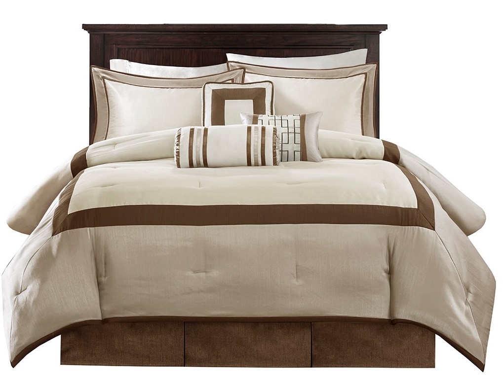 The taupe color creates a large border around the edge of the comforter and a brown border is used inside to really give the light taupe a pop in the center. The decorative pillows make use of these same borders and colors for a completely matching set while the brown bedskirt adds some drama with its dark coloring. With these neutral colorways and large borders, this set will be easy to accessorize in any room in your home.