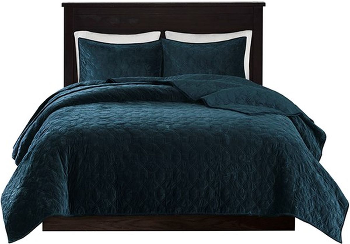The Madison Park Harper Faux Velvet Reversible 3 Piece Coverlet Set is perfect for those seeking a casual and comfortable update to their bedroom. The velvet coverlet can act as the perfect layering piece, adding a decorative element of soft texture to your bedding ensemble with its gorgeous quilted design. The rich teal color and the geometric stitch pattern, however, makes the coverlet charming enough to stand alone on your top of bed as an alternative to your comforter.