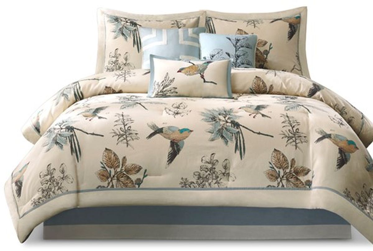 The Madison Park Quincy 7 Piece Comforter Set brings a warm country update to your bedroom. This cotton twill comforter features a classic leaf and bird print on the face with a solid reverse that adds a splash of color to the cottage look. Two matching shams pair perfectly with the comforter and three decorative pillows add dimension.Read More