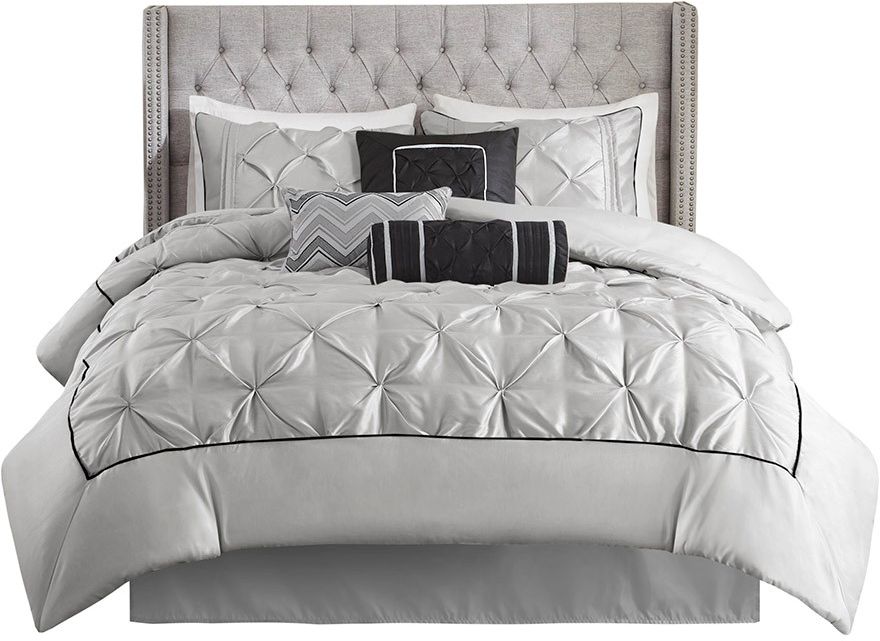 This beautifully tufted bed is from the Laurel bedding collection. Its grey coloring makes this set create a statement in your bedroom. The collection is made from 100% polyester polyoni and has pieced fabric sewn together providing added dimension. It is finished with a smooth edge of fabric that creates a beautiful border around this comforter.