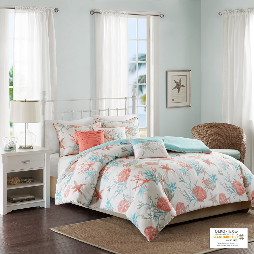 For a vibrant coastal update to your bedroom, the Madison Park Pebble Beach 6 Piece Duvet Cover Set is perfect for you! This cotton duvet cover and shams feature a starfish and coral motif in vivid colors to brighten your space. The solid reverse adds a splash of color to complement the coastal design. Three decorative pillows with embroidery and fabric manipulation add the finishing touches to the duvet cover set. This bedding set is also OEKO-TEX certified, meaning it does not contain any harmful substances or chemicals to ensure quality comfort and wellness. A button closure helps secure a comforter insert within the duvet cover and inside ties in the corners help prevent it from shifting (insert is NOT included).