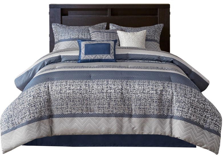 Luxurious and transitional style jacquard 7 piece comforter set.