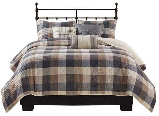 Cabin farmhouse style 6 piece coverlet set in all over buffalo plaid pattern.