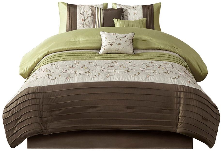 The Serene Bedding Collection provides an elegant look to your home. The top of the comforter is a mix of green, chocolate brown, and taupe with piecing details while the taupe section has an embroidered floral pattern for a soft divide from these bold colors. Made from polyester dupioni, this fabric will produce a shine and pick up the light on both the comforter and shams. The decorative pillows come in a combination of solids, stripes, and embroidery to pull this whole set together.