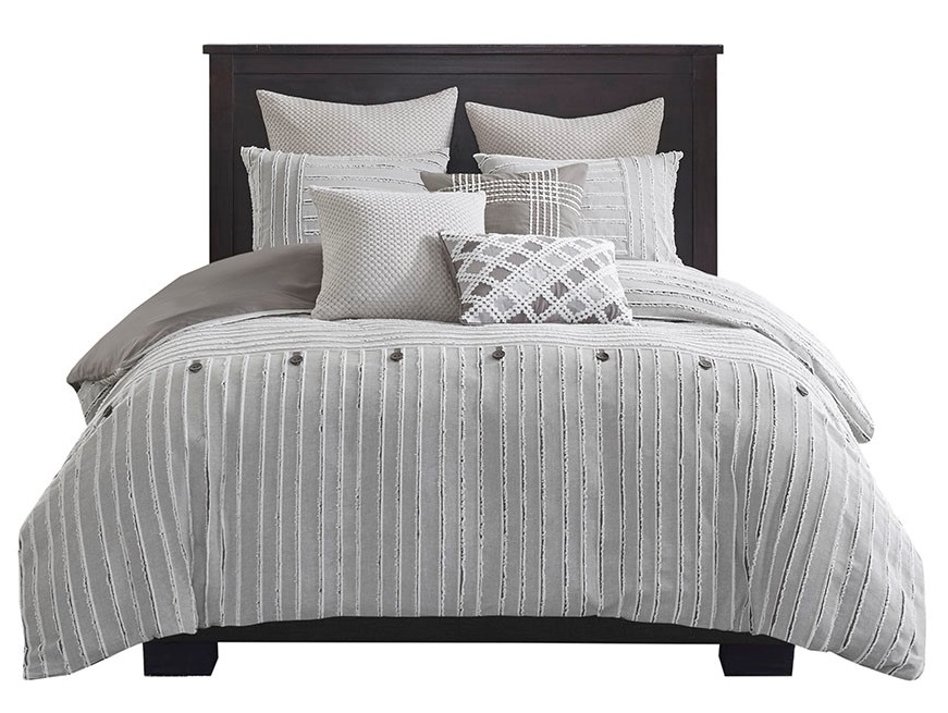 Add a quaint farmhouse charm to your bedroom with the Madison Park Signature Essence Cotton Clip Jacquard Comforter Set. This cotton clip jacquard gray comforter features a pieced design with striped pattern and decorative buttons, for a casual look.Read More