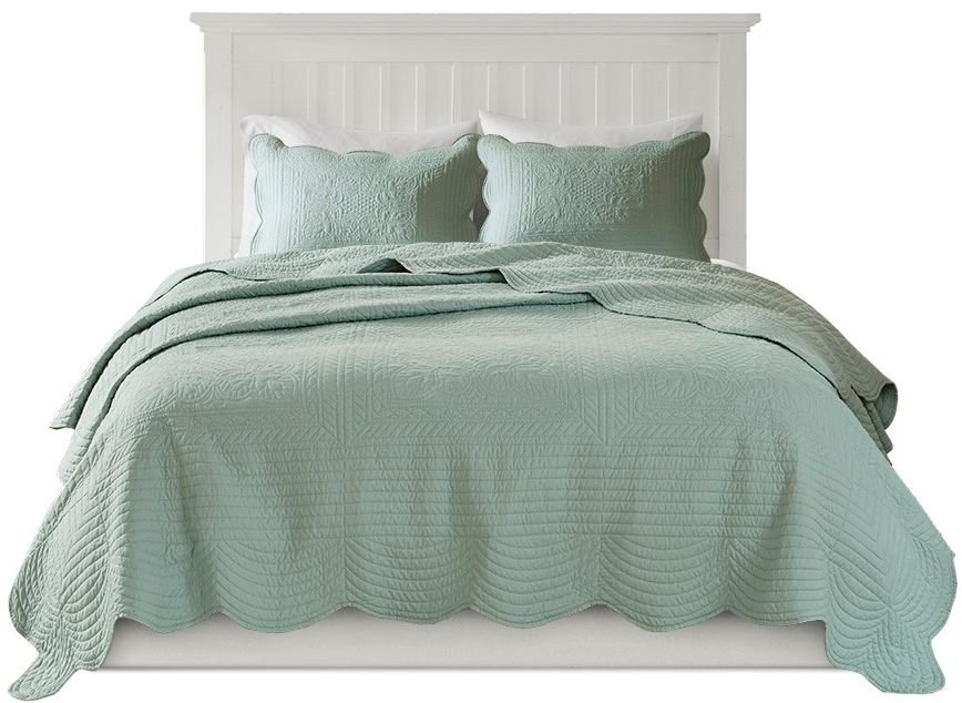 The Madison Park Tuscany 3 Piece Reversible Scalloped Edge Coverlet Set is perfect as a layering piece or as an alternative to your comforter for a charming country look. The coverlet and shams flaunt a classic stitch pattern with scalloped edges that add an elegant touch to your bedroom. This reversible coverlet is filled with cotton filling and features a soft microfiber face, giving your bed a cozy cottage look. This farmhouse-inspired coverlet also has an antimicrobial treatment that prevents bacteria buildup for odor control, keeping the fabric fresher, longer.