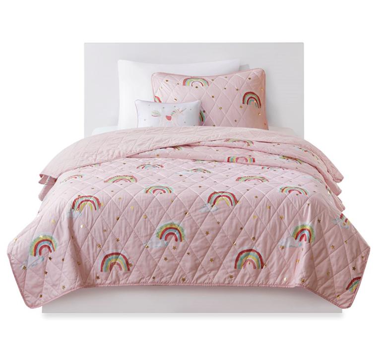 Bring a whimsical charm to your girl’s bedroom with the Mi Zone Kids Alicia Rainbow with Metallic Printed Stars Reversible Coverlet Set. An adorable rainbow and gold metallic star print adorn the pink coverlet and 2 shams (1 in twin or twin xl) for a cute and playful look.Read More