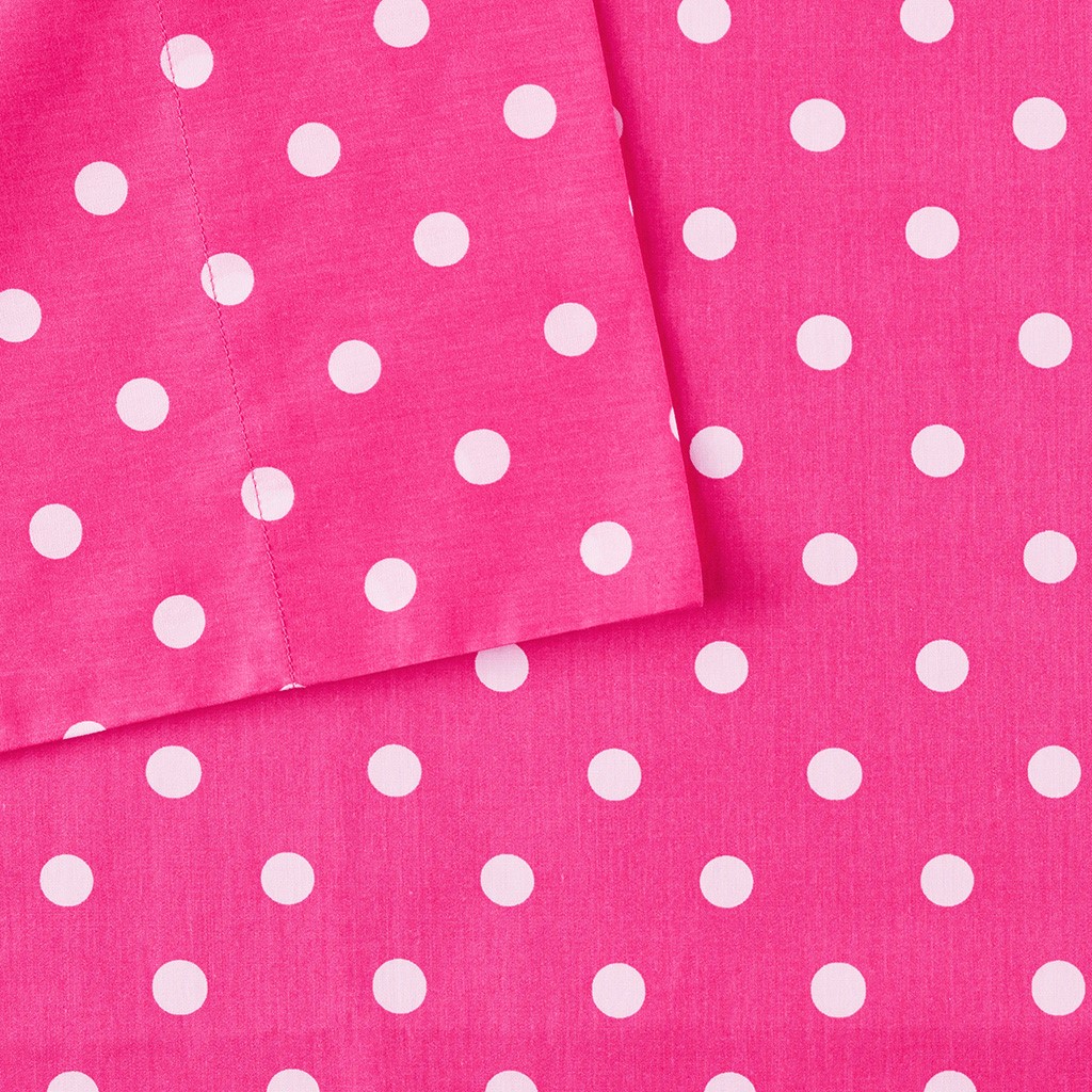 Brighten up your room with the Mi Zone polka dot sheet set. The bold colors and fun print will liven up any room. Made from 100% cotton percale, this sheet set will last wash after wash. The fitted sheet will fit up to a 16" mattress.
