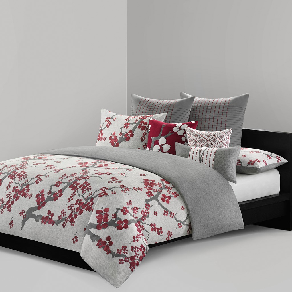 Create an oasis out of your space with the Natori Cherry Blossom Bedding Collection. This elegant duvet cover set features a 100% cotton sateen face with the light grey ground and cherry blossom branches inching up to the top. The heather grey reverse has a 100% cotton percale dark for a dramatic feel.Read More