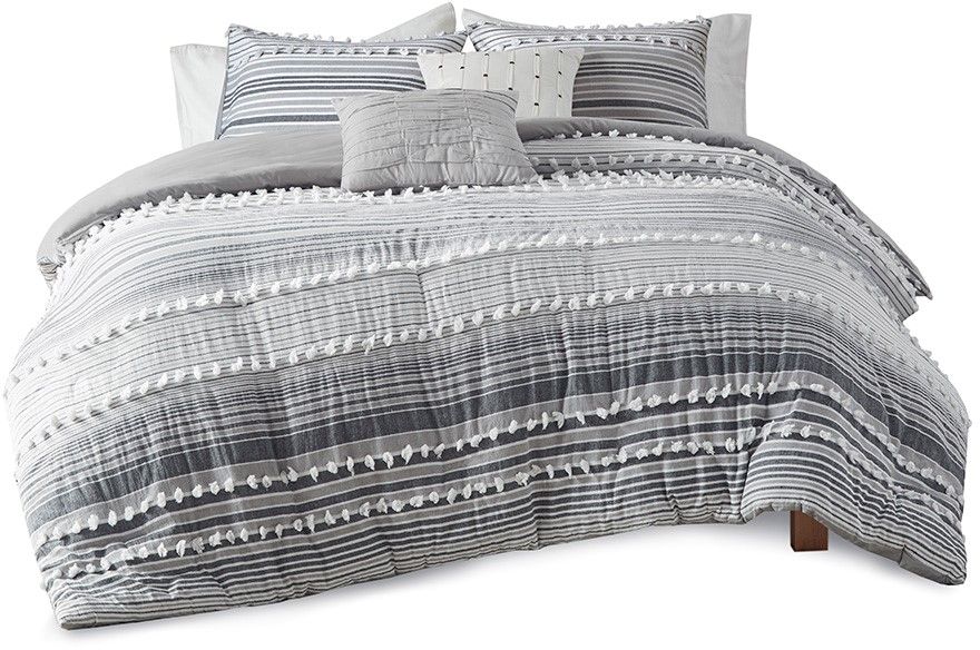 Give your bedroom a soft casual update with the Urban Habitat Calum Cotton Duvet Cover Set. The cotton clipped jacquard duvet cover features yarn-dyed stripes of tonal grey and off-white, for a soft and alluring look. Matching shams mirror the design seen on top of the bed, while two decorative pillows with hypoallergenic polyester filling add the finishing touches. This bedding set is also OEKO-TEX certified, meaning it does not contain any harmful substances or chemicals to ensure quality comfort and wellness. Button closures on the duvet cover secure a padded insert (NOT included) within the duvet cover and internal corner ties prevent it from shifting.