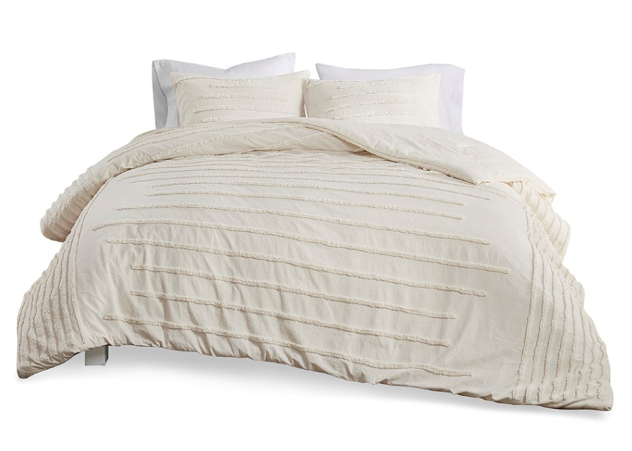 Two matching shams complement the comforter with horizontal chenille stripes, completing the chic look. Machine washable for easy care, this bedding set is OEKO-TEX certified, meaning it does not contain any harmful substances or chemicals to ensure quality comfort and wellness.