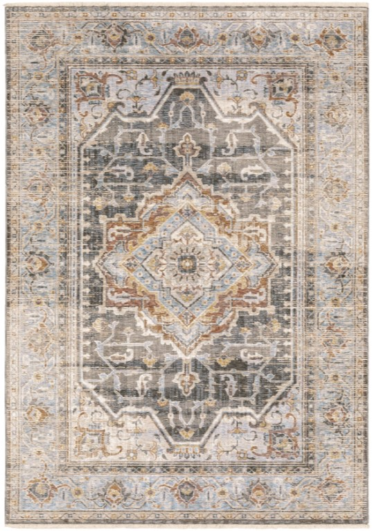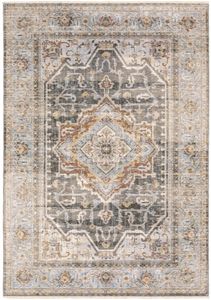 The Maharaja rug features hues of beige, brown, gray and light blue made of polyester fabric.Read More