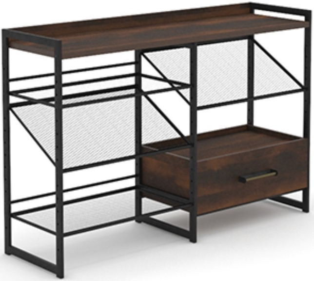 The top surface of this display bookcase features a cornered edge for displaying home décor and photos of your family. This bookshelf with drawer features shelves that can be tilted for displaying books, magazines, artwork, and photos. A highly configurable design allows for customizable placement of shelves and drawer, all according to your personal preference. This bookcase with shelves is finished on all sides for versatile placement – it will look polished and complete from every angle. Finished in Barrel Oak™ with powder coated metal shelves and frame, this modern bookshelf will catch the eye of guests, and make you proud of your purchase.