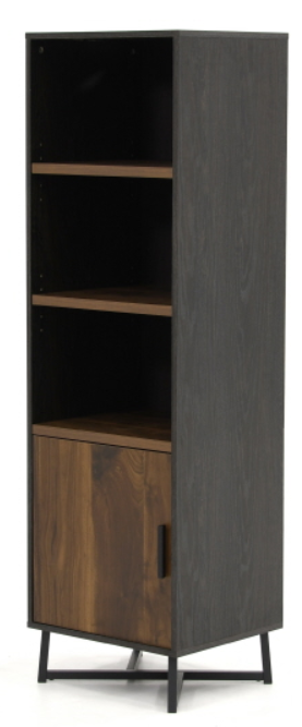 Simple, sleek and everything that you need. Create the additional storage space your home needs without having to sacrifice on the style that you love with this bookcase with doors from the Canton Lane collection. This industrial bookcase features three spacious shelves that are ideal for storage and display of a variety of different items like your collection of novels, decorative plants, work binders and framed photos of your family and friends. Included are three adjustable shelves that have the ability to move to different heights to create flexible storage for items of all shapes and sizes. Each shelf features a strong and lightweight 1” panel construction. Behind the door is a hidden storage area for items you prefer not be seen. This reversible door opens left or right – whichever fits you best. Finished in Brew Oak with Grand Walnut accents and a black powder coated metal base, this 3-shelf bookcase is just what you’ve been looking.