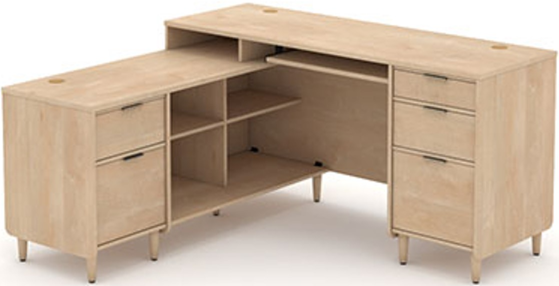 This home office desk features a slide out keyboard/mouse shelf that opens and closes on smooth metal runners. This L-shaped desk with storage includes three easy gliding standard drawers on metal runners, and two file drawers with full extension slides that accommodate letter-size hanging files. Cubbyhole storage allows for easy access and placement of books, bins and folders. The multiple grommet holes and pass-throughs allow you to keep all your cords and wires neat and out of the way. For versatility and ultimate customization, the return can be fastened to the left or right side to fit the needs of any room in your home. Finished on all sides in Natural Maple and accented with solid wood feet, handsome mid-century modern desks, like this one, will take your office space to a whole new level.