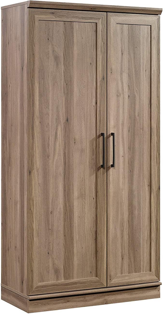 Stylish storage where you need it. This storage cabinet from the HomePlus will fit all your storage needs. Behind each framed panel door, it features one fixed shelf and two adjustable shelves to store clothes, books, towels and more! It also includes a swing-out storage door with three adjustable and three fixed shelves for additional storage and organization! Other features include cord access through the back panel and adjustable base levelers. Finished in Salt Oak, this good looking storage cabinet will have your home looking clean and organized in no time.