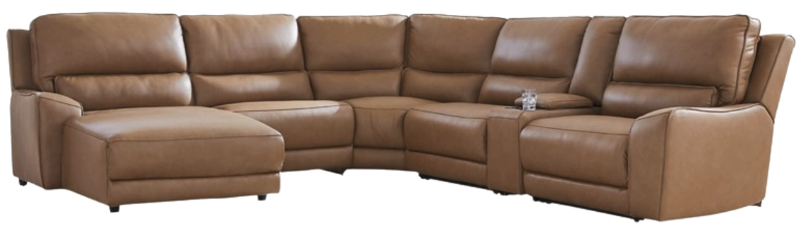 Live and lounge luxuriously. This power reclining sectional with chaise brings an ultra-stylish flair to your home’s central hub. Its seating area is wrapped in top grain leather in a rich caramel color, giving you a trend-right look made all the better with high-quality materials.Read More
