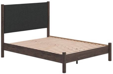 Crafted with both form and function in mind, this queen upholstered panel platform bed brings a dash of retro-cool character to your modern boho aesthetic. Its textured black headboard fabric adds a trend-right touch to the classic silhouette. Warmly welcoming with a rich brown finish.Read More