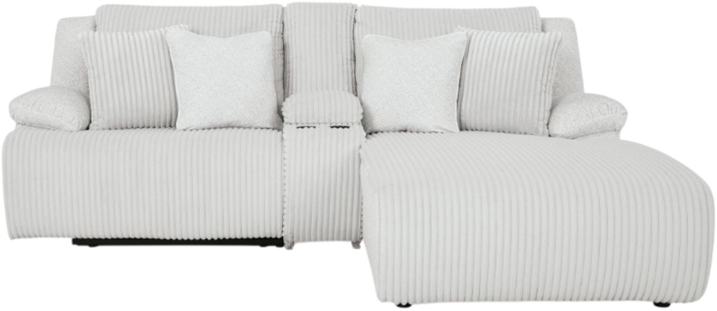 Includes left-arm facing recliner, console with storage and right-arm facing press-back chaise