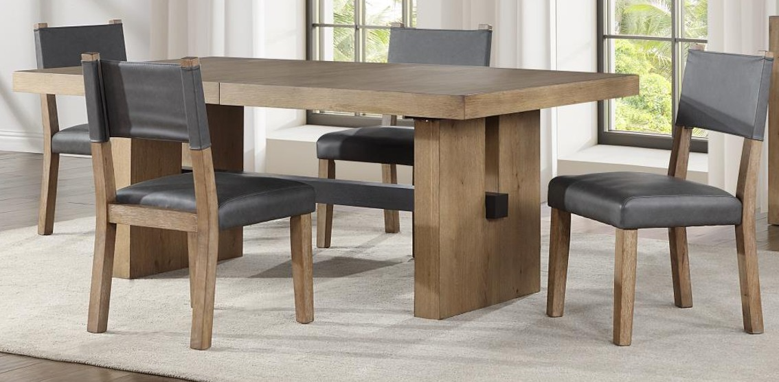 With rustic gray vegan leather side chairs offering comfortable cushioned seating this set presents a primitive yet upscale interpretation of rustic elegance