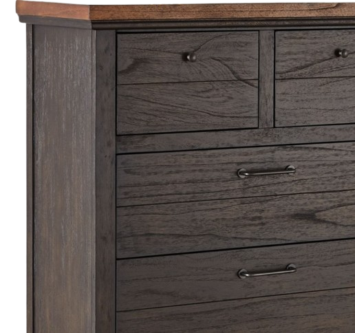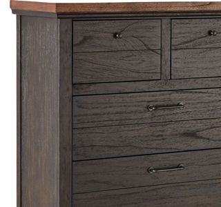 A rustic, farmhouse-inspired bedroom, Bear Creek features a sable finish that contrasts beautifully with caramel stained tops and cap rails. The plank-effect drawer fronts are a stylish addition to the antiqued pewter finish hardware. Deep drawers offer plenty of storage for bulky items like sweaters. A stylish piece that offers ample vertical storage for the bedroom.Read More