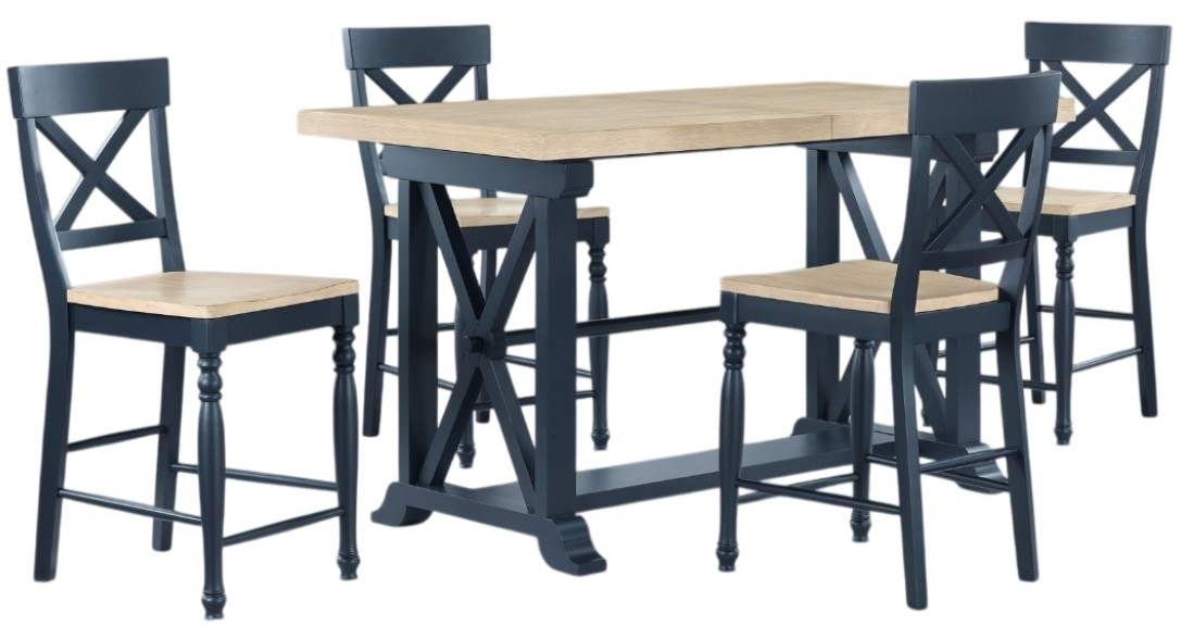 Bring charm and functionality to your dining space with the Darcy 5-piece counter set. The extendable table features a natural wood top and squared midnight blue legs, blending farmhouse charm with modern elegance. With its 18-inch leaf, the table expands from 64 to 82 inches, comfortably seating up to six guests.Read More