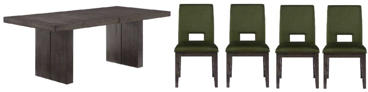 5 piece set includes the Evan 78-96" dining table with 18" leaf and 4 Evan green velvet side chairs. Each item also sold separately